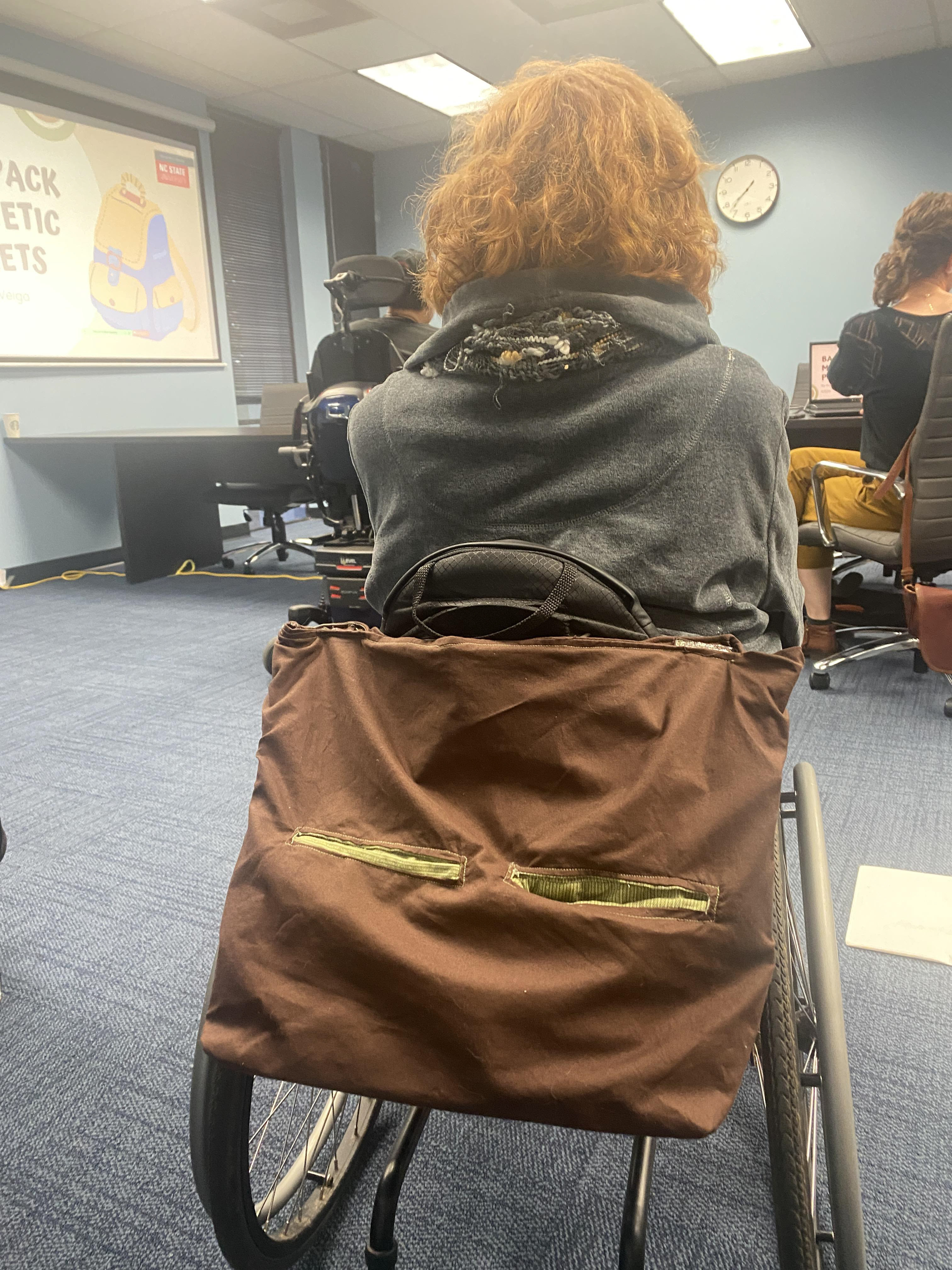 Pam is on the go and needs easy access to her things, she listed out her priorities to ensure that this bag is good for her. The bag will be on the back of her wheelchair and as she has limited range of motion, the ease of accessing her things is of utmost importance.
